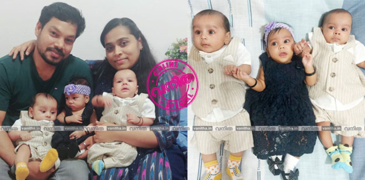 അന്നു തൊട്ടേ... ഒരാരു പെൺകുഞ്ഞ് രണ്ട് ആൺകുഞ്ഞുങ്ങൾ എന്ന ആഗ്രഹം ഞങ്ങൾ മനസിൽ ഉരുവിട്ടു കൊണ്ടേയിരുന്നു. എന്തിനേറെ പേരുവരെ കണ്ടുവച്ചു. സന്തോഷവാർത്തയറിഞ്ഞ വീട്ടുകാരും ഹാപ്പിയോടു ഹാപ്പി. ഒടുവിൽ കാത്തിരുന്ന ദിനം വന്നെത്തി. 2022 ജനുവരി 12ന് എട്ടാം മാസത്തിൽ ഞങ്ങളുടെ രാജകുമാരൻമാരും കുഞ്ഞു രാജകുമാരിയും ഇങ്ങുപോന്നു. പ്രീമെച്ച്വർ ബെർതിന്റെ ചെറിയ പ്രശ്നങ്ങൾ ഉണ്ടായിരുന്നുവെങ്കിലും ദൈവം അധികം ടെൻഷനടിപ്പിക്കാതെ ദൈവം അവരെ ഞങ്ങളുടെ കൈകളിലേക്ക് വച്ചുതന്നു. റിഥാനും ഇസാനും ബ്രിസയ്ക്കും യഥാക്രമം 1.800, 1.600, 1.400 എന്നിങ്ങനെയായിരുന്നു ഭാരം. ഓരോരുത്തരേയും ദിവസങ്ങളോളം എൻഐസിയുവിൽ വച്ചിട്ടാണ് ഞങ്ങളുടെ ൈകകളിലേക്ക് ഡോക്ടർമാർ തന്നത്. ഇത്തിരി കാത്തിരുന്നെങ്കിലെന്താ... കാത്തുവച്ചിരുന്ന നിധികളെ ഒരു പോറൽ പോലുമേൽക്കാതെ ദൈവം തന്നില്ലേ... ഞങ്ങൾക്ക് അതുമതി.