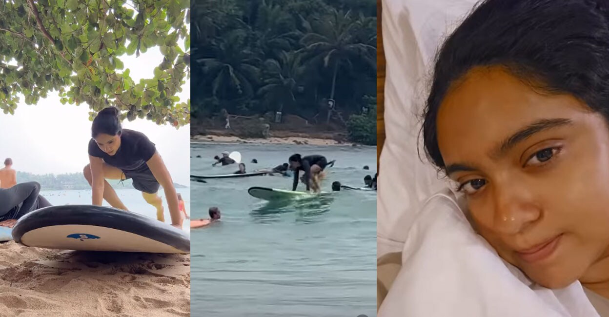 സർഫിങ് പഠിക്കുന്ന വിഡിയോ സോഷ്യൽ മീഡിയയിൽ പങ്കുവച്ച് നടി സന അൽത്താഫ്. നിരവധി തവണ വെള്ളത്തിൽ വീണിട്ടും വീണ്ടും വീണ്ടും പരിശീലനത്തിലേർപ്പെടുന്ന സനയാണ് വിഡിയോയിൽ. സർഫിങിനിടെ പരുക്ക് പറ്റിയതും മുറിവുണ്ടായതും വെയിലേറ്റ് കരുവാളിച്ചതും എല്ലാം സന വിഡിയോയിൽ ഉൾപ്പെടുത്തിയിട്ടുണ്ട്. ശ്രീലങ്കയിൽ അവധി ആഘോഷിക്കുന്നതിനിടെ ഹിരികേതിയ ബീച്ചിലാണ് സനയുടെ സർഫിങ് പഠനം.