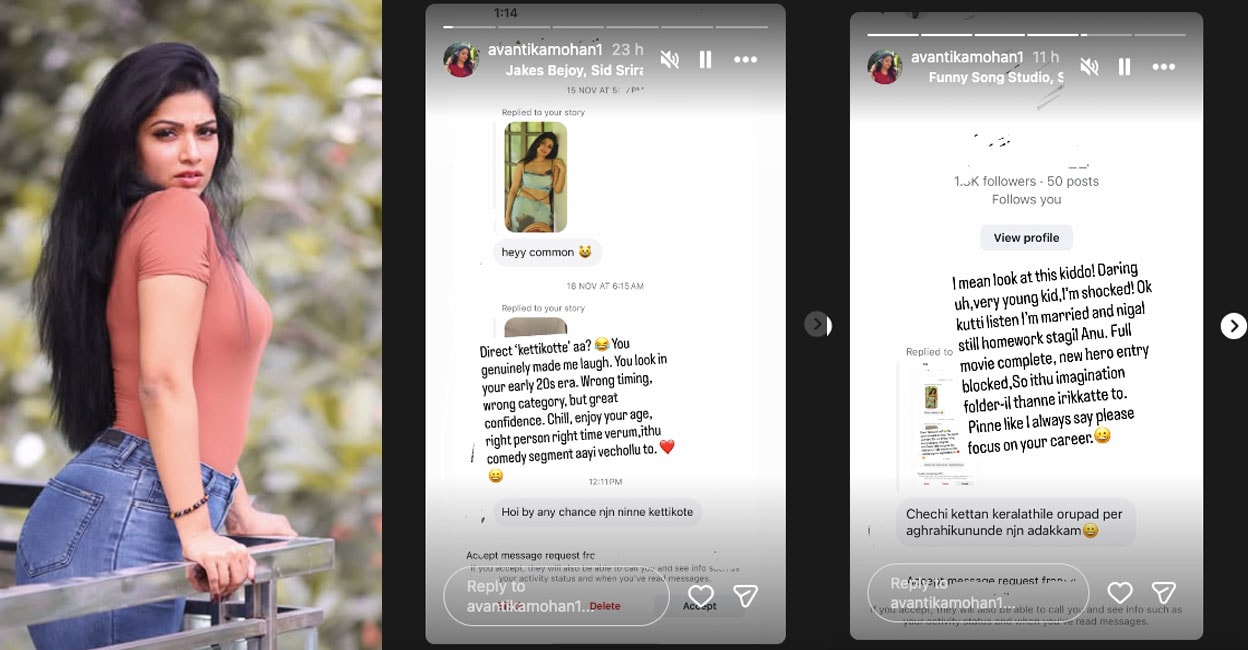 ‘ചേച്ചിയെ കല്യാണം കഴിക്കാൻ ഞാൻ ഉൾപ്പെടെ കേരളത്തിൽ ഒരുപാട് പേർ ആഗ്രഹിക്കുന്നുണ്ട്’ എന്നായിരുന്നു മറ്റൊരു ടീനേജ് പയ്യന്റെ മെസ്സേജ്. ഇതിന്, ‘ഈ കുട്ടിയുടെ ഒരു കാര്യം നോക്കൂ! എന്ത് ധൈര്യമാണ്! കണ്ടിട്ട് ഒരു ചെറിയ പയ്യനാണല്ലോ, ഞാൻ ശരിക്കും അമ്പരന്നുപോയി. കുട്ടി, ഒരു കാര്യം ശ്രദ്ധിക്കൂ, ഞാൻ വിവാഹിതയാണ്. നീ ഇപ്പോഴും ഹോംവർക്ക് ഒക്കെ ചെയ്ത് പഠിച്ചു നടക്കേണ്ട പ്രായത്തിലുമാണ്. എന്റെ ജീവിതം എന്ന സിനിമ മുഴുവനായി പൂർത്തിയായിക്കഴിഞ്ഞു, അതിലേക്ക് പുതിയൊരു നായകന്റെ എൻട്രി ഇനി സാധ്യമല്ല. അതുകൊണ്ട് നിന്റെ ഈ ആഗ്രഹം ആ ഭാവനയുടെ ഫോൾഡറിൽ തന്നെ ഇരിക്കട്ടെ കേട്ടോ. ഇപ്പോൾ നിന്റെ കരിയറിൽ മാത്രം ശ്രദ്ധ കേന്ദ്രീകരിക്കൂ’ എന്നാണ് അവന്തിക മറുപടി കുറിച്ചത്.