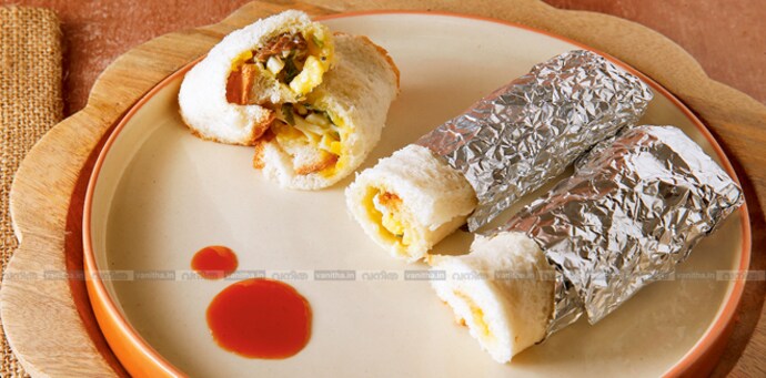 ∙ ഓരോ ബ്രെഡ് സ്ലൈസിലും ഫില്ലിങ് നീളത്തില് വച്ചു മുറുകെ ചുരുട്ടുക.